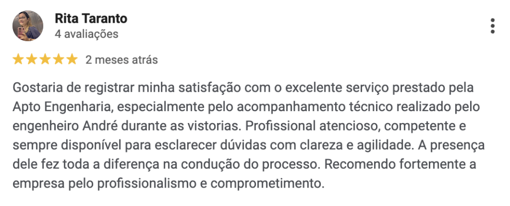 A Apto Engenharia realiza uma inspeção completa do imóvel, conforme as normas vigentes, emitindo um laudo técnico detalhado. A análise é minuciosa e inclui tanto problemas visíveis quanto aqueles que exigem instrumentos ou técnicas específicas para serem identificados.